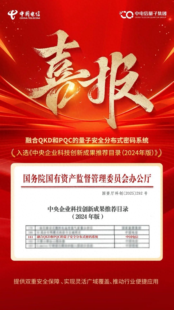 近日,國務(wù)院國資委正式發(fā)布《中央企業(yè)科技創(chuàng)新成果推薦目錄(2024年版)》,中國電信自主研發(fā)的“融合QKD和PQC的量子安全分布式密碼系統(tǒng)”成功入選,充分認可了中國電信在量子科技領(lǐng)域的前瞻性戰(zhàn)略布局和自主核心技術(shù)攻關(guān)的創(chuàng)新能力。